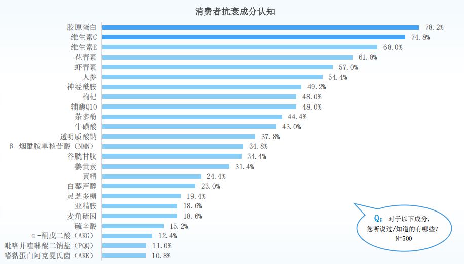Dzięki edukacji i rozwojowi rynku kolagen jest obecnie cieszącym się dużym uznaniem wśród konsumentów „składnikiem przeciwstarzeniowym”. W badaniu dotyczącym zrozumienia głównych składników przeciwstarzeniowych, kolagen (78,2%), witamina C (74,8%) i witamina E (68%) to trzy najważniejsze składniki, które konsumenci uznają za doustne produkty przeciwstarzeniowe. Wśród 5 składników przeciwstarzeniowych, które są najczęściej postrzegane w różnych grupach wiekowych, kolagen jest niewątpliwie „składnikiem gwiazdowym”.